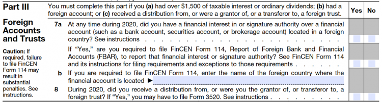 As you can see above, the first question regarding Foreign Accounts and Trusts is, "At any time, did you have a financial interest in or signature authority over a financial account (such as a bank account, securities account, or brokerage account) located in a foreign country?"